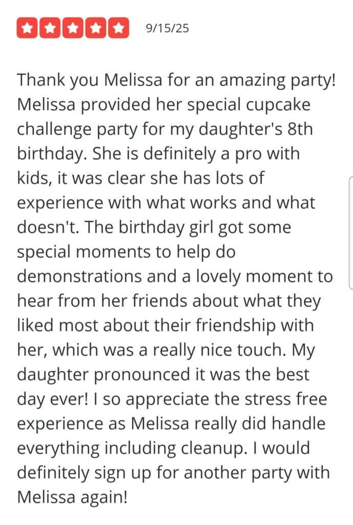 I’m proud to have earned a consistent 5-star rating on Yelp and Google thanks to years of happy clients. Parents know they can count on me to take care of everything while their children and guests enjoy an unforgettable Cupcake Challenge experience.